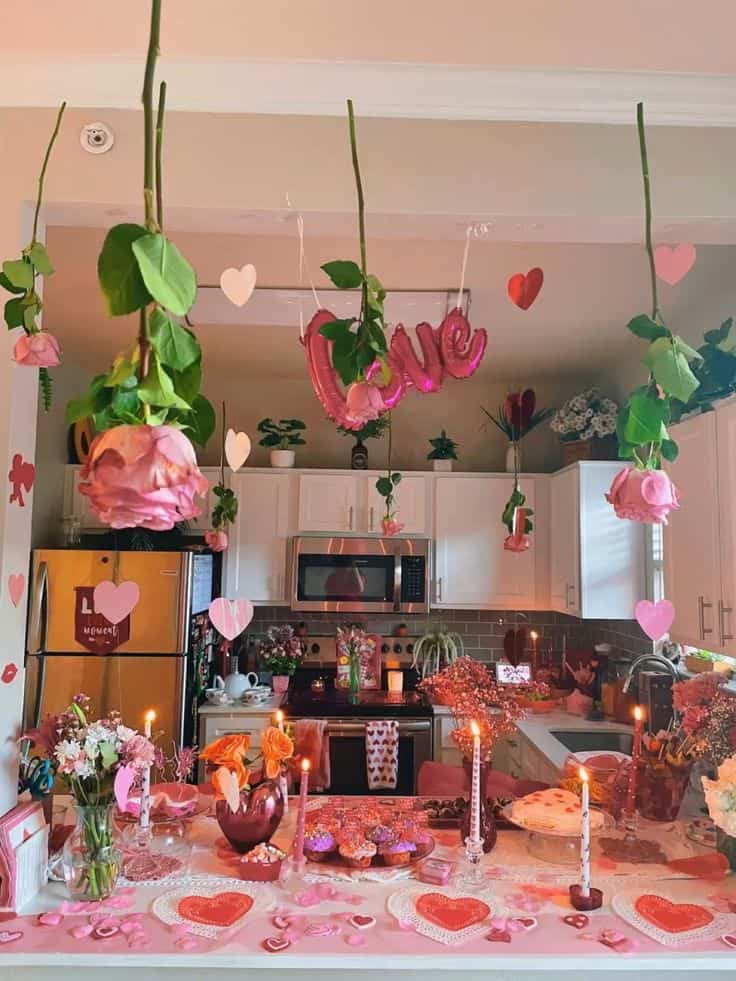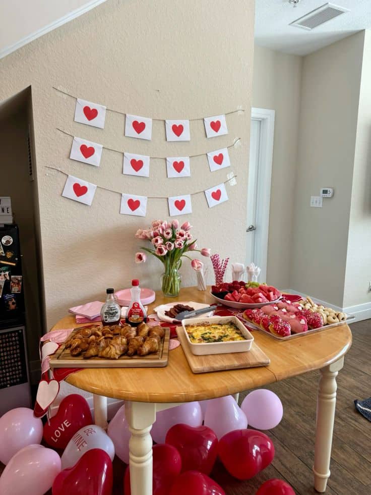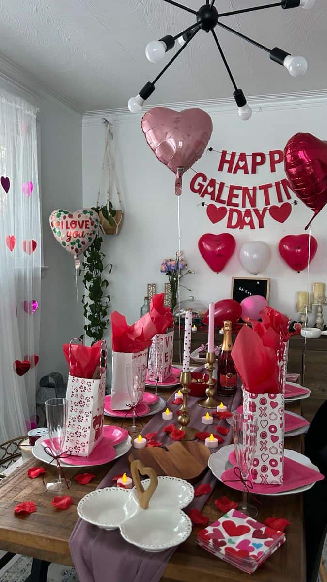 A Valentine’s Day party decor idea is to have floating heart balloons all around your dining table and living room 🙂